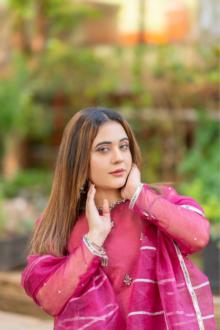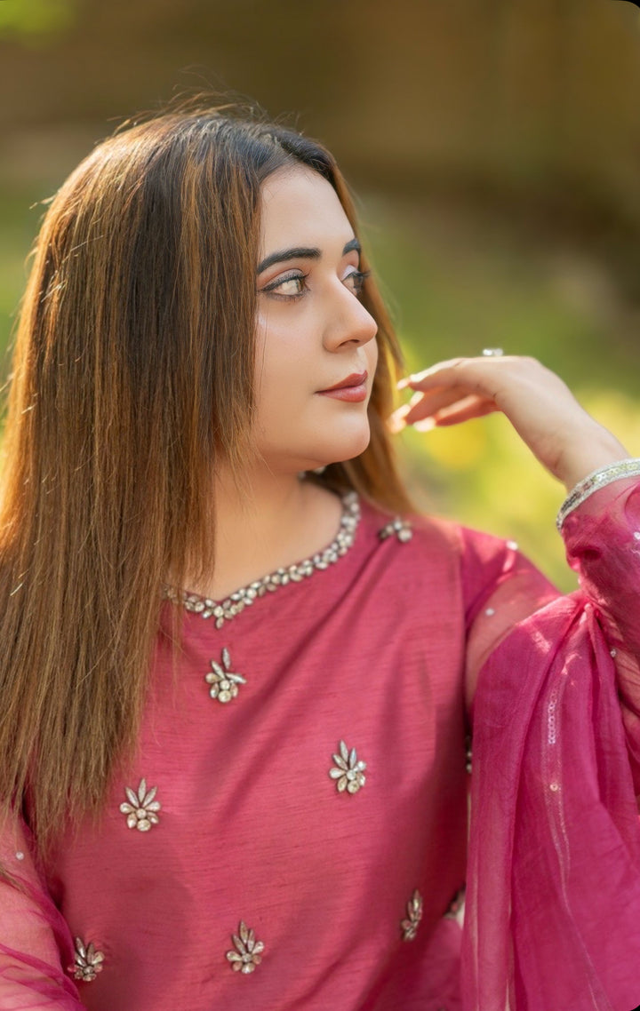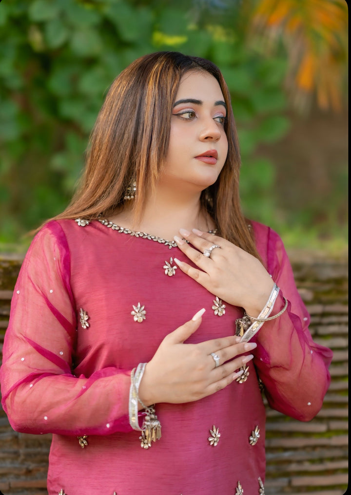 Aarzu’s stunning mehron fused raw silk 3-piece dress features intricate stone work for an elegant and luxurious look. The outfit is beautifully detailed with delicate stone embellishments on the neckline and throughout the dress, complemented by an organza dupatta adorned with silver lace. Complete with stylish plaza pants, this ensemble is perfect for Eid and other festive occasions. Stand out in sophistication and grace with this exquisite design.